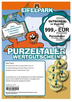 Wollen Sie z. B. den Eintritt für einen unvergesslichen Tag im Eifelpark verschenken und zusätzlich auch noch ein Taschengeld für den Ausflug in den Familien Freizeitpark, dann ist der Purzeltaler-Wertgutschein genau das Richtige!